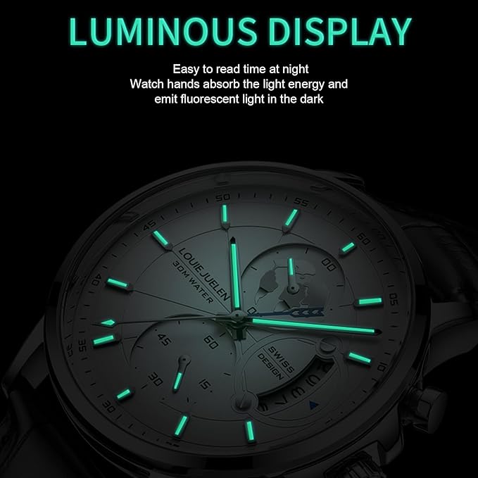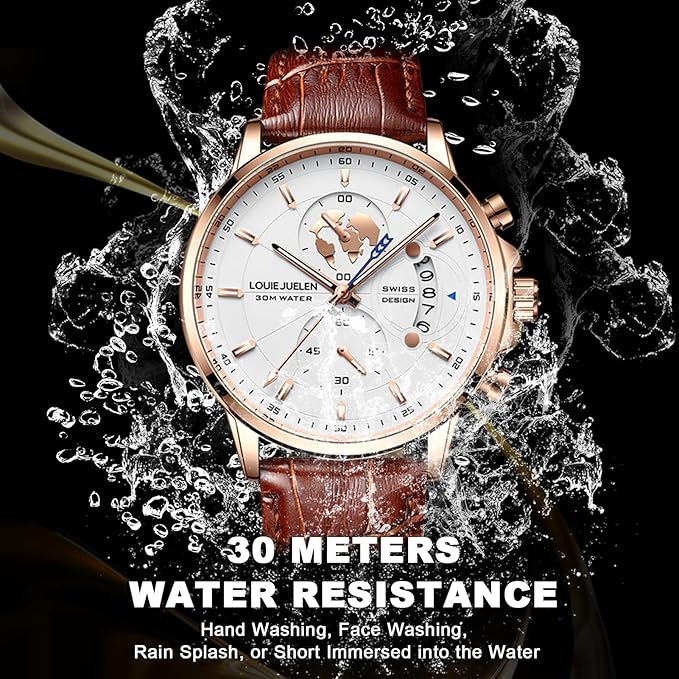 - 30M/98FT Waterproof Chronograph Watch: Suitable for accidental rain splash, hand washing, or short immersed into the water, but not for swimming and showering, bathing, diving, or snorkeling, etc. Please do not press any buttons or adjust time in hot water, this will affect the water resistance of this men’s analog watch. If you have any questions, please contact us asap and we will help you solve the issue within 12hrs