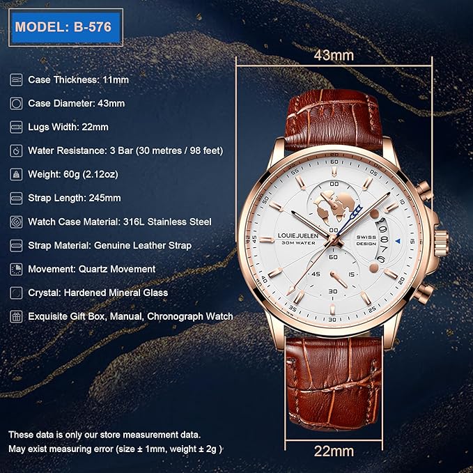 - Luxury and Luminous Analog Watch: Watch case size: 43mm; band size: 22mm; this men’s formal watch built with durable imported Japanese quartz movement and chronograph function which provide precise time display and multipurpose use; luminous points needle analog watch dial display is convenient to read at night; large cambered perpetual calendar area is easy to see date time; hardened mineral glass lens resists scratches
